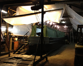 As the evenings have drawn in there has been quite a bit of late working - this is a lovely atmospheric shot of the boat, and note the extra sheeting that was added for the gritblasting and to help keep the temperature up for the paint curing